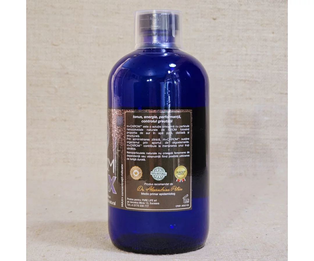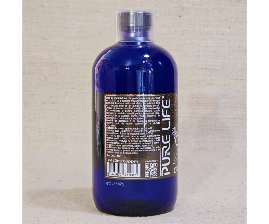 Colloidal solution with basic pH, rich in chromium ions charged with positive electric charge , in distilled and structured water, recommended for diabetics and people who have a chromium deficiency in the body . The use of structured water adds a special therapeutic effect to the product.