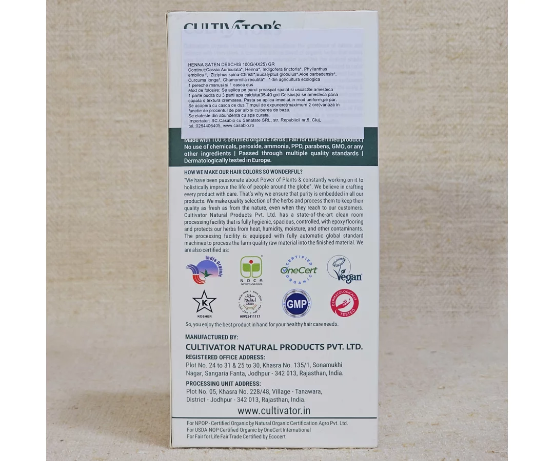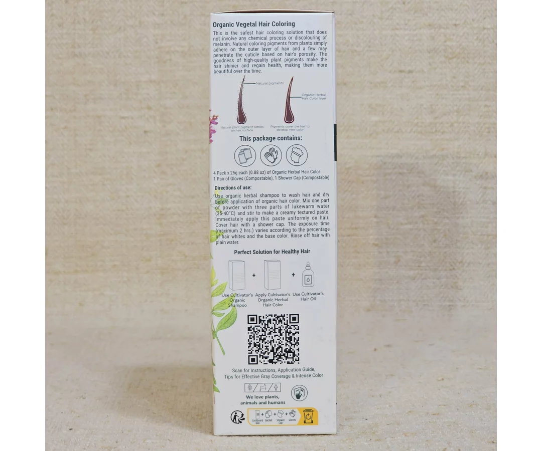 Cultivator’s Organic Herbal Hair Color combines the goodness of nature and science with innovation. A complete unique blend of organic herbs that colors your hair naturally. Organic vegetable coloration provides the desired shade, shine & nourishment to the hair. The semi-permanent color is developed to color your hair effortlessly as it adheres to hair cuticles easily. Every ingredient has its own benefits that work miracles for hair health. Our colorations are powerhouses of full concentrated plant powder that gives a revitalizing effect to the scalp & hair. Cultivator’s Organic Herbal Hair Color is developed from hand-grown organic, fair for life herbs and processed with world-class technology to preserve the active properties. Fair for Life certification promotes an approach of Fair Trade that allows all producers and workers who are at a socio-economic disadvantage to access a wider range of social and economic benefits.