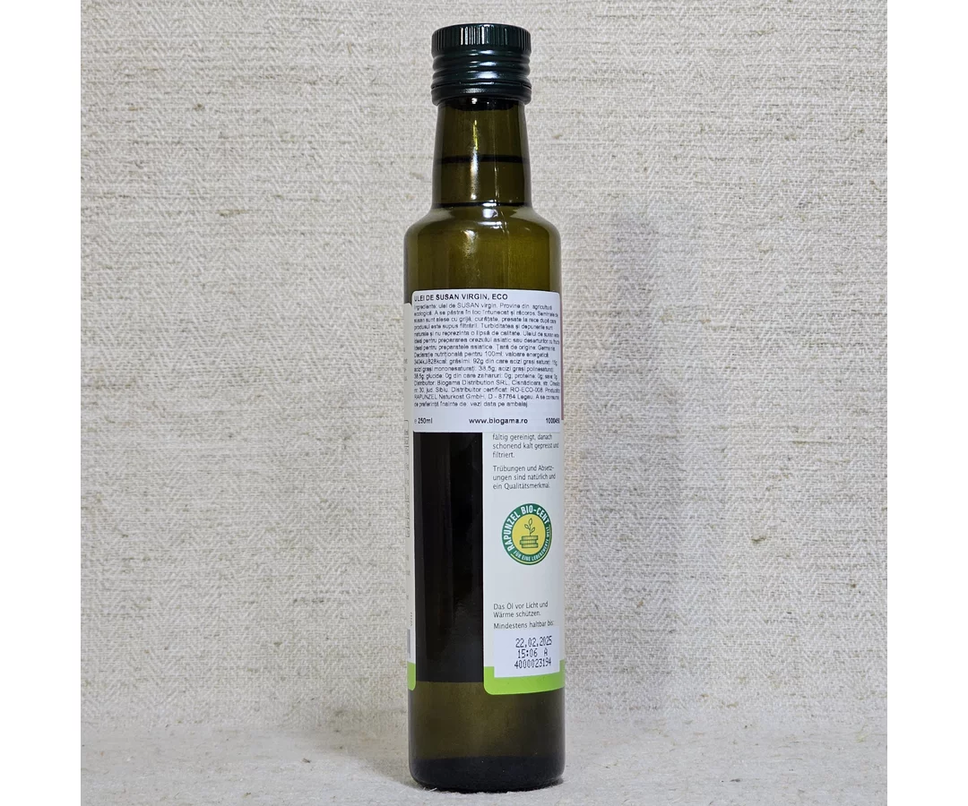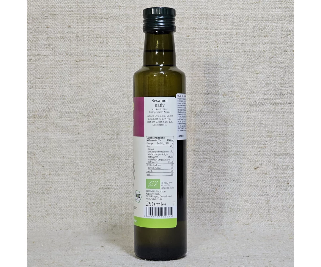 Sesame oil is produced by cold pressing technology. Gives a special taste to food, especially bread. It is extremely suitable for frying vegetables and tasty in sauces based on vinegar or lemon juice for salads of spinach, nuts, broccoli, endives, etc.