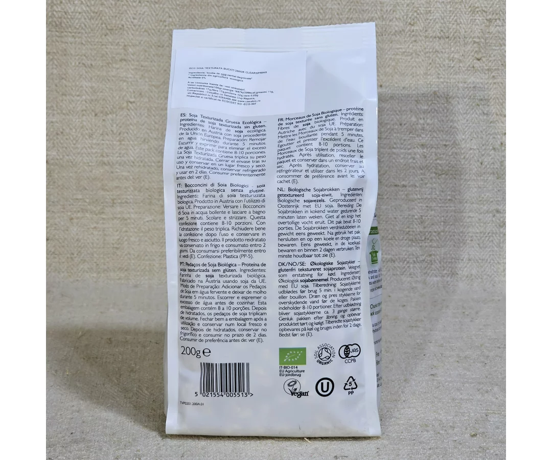 Preparation: for rehydration add the product to boiling water/vegetable juice and soak for 10 minutes, then drain and gently squeeze to remove excess liquid. Used as a vegan alternative to minced meat, it is ideal for spaghetti bolognese, shepherd's pie, vegan lasagna, etc. After rehydration the product triples in weight, one packet is equivalent to 10-12 servings.