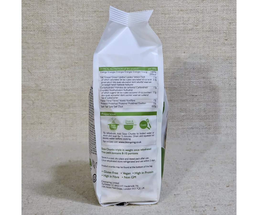 Textured soy protein that cooks quickly and can be prepared in a variety of recipes as a meat substitute. These vegetable protein chunks are obtained by cold-pressing the soybeans (to remove the oil content), followed by pressure steaming to form the chunks and finally dehydrating them. They have an extremely delicate yet substantial texture and take on the flavor of any dish they are added to.