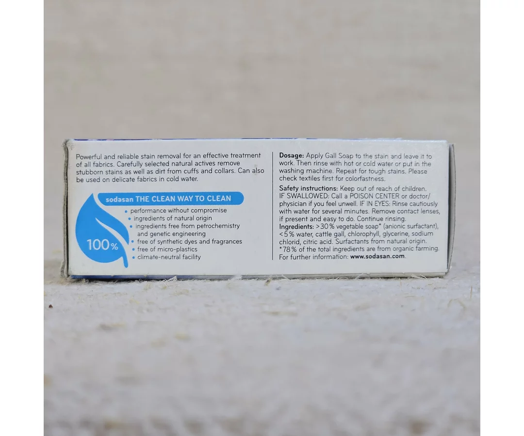 Use in small amounts applied to stains or very dirty clothes before washing. Made from organic vegetable oils and bovine bile. Cattle raised in a natural environment and not in artificial farms, and their slaughter was not done in order to obtain the raw material for this product!