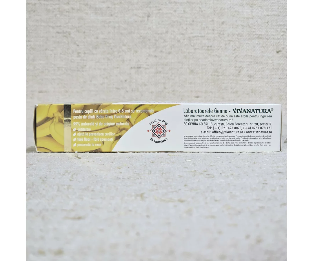 A 99% natural and naturally derived toothpaste with a banana flavor, ideal for children learning to brush their teeth, even if accidentally ingested. This toothpaste is specially formulated for young children, suitable for ages 2-14.