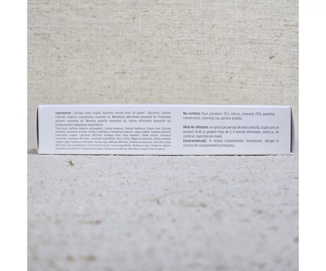 A toothpaste formulated with colloidal silver, clay, and essential oils that provides an antiseptic effect on the oral cavity. It helps alleviate pain that may occur during brushing.
