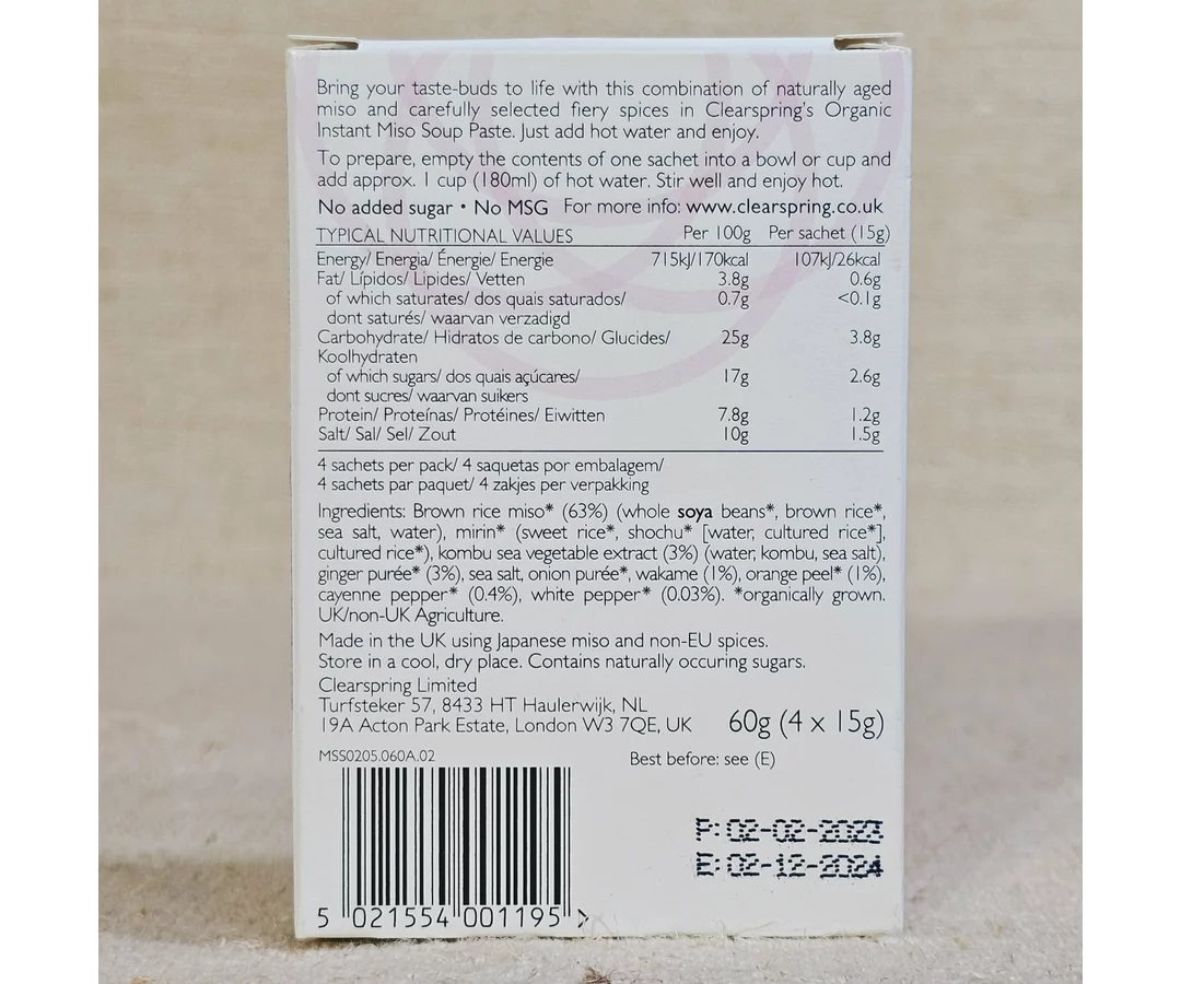 brown rice miso * (whole soybeans *, fermented brown rice *, sea salt, water) 63%, mirin * (sweet rice *, shochu * [water, fermented rice *], fermented rice *), kombu seaweed extract (water, kombu, sea salt) 3%, ginger puree * 3%, sea salt, onion puree *, wakame seaweed 1%, orange peel * 1%, cayenne pepper * - 0.4%, white pepper * 0.03%.